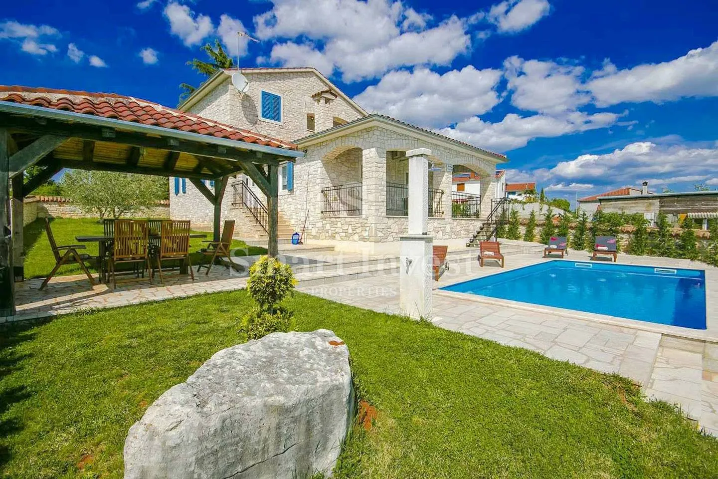 POREČ okolica, prekrasna kamena vila s bazenom na vrlo mirnoj lokaciji u malom istarskom gradiću, svega 10 minuta vožnje udaljenom od mora i Poreča. RASPORED I OPREMA Vila ukupne površine 162.53 m2 (stambena površina 145 m2) smještena je na zemljištu površine 770 m2, ima 3 spavaće sobe, 3 kupaonice + 1 WC. U prizemlju se nalazi ulazni hodnik, predsoblje, prostrani dnevni boravak s kaminom, kuhinja s blagovaonicom, spavaća soba, kupaonica, ostava, WC. Iz blagovaonice i dnevnog boravka se izlazi na veliku natkrivenu terasu od 20 m2 s prekrasnim pogledom na bazen i dvorište. Na katu se nalaze još dvije komforne spavaće sobe, od kojih jedna ima vlastitu kupaonicu i izlaz na natkrivenu terasu od 9 m2, a druga spavaća soba ima odvojenu kupaonicu. Vila je sagrađena 2013. godine u autohtonom, istarskom stilu. Prodaje se kompletno opremljena namještajem i tehnikom. Grijanje/hlađenje: klima + grijače ploče (električno), kamin u dnevnom boravku. U vrtu se nalazi bazen od 33 m2 i natkrivena ljetna kuhinja, natkriveni parking za dva automobila i uređene zelene površine. LOKACIJA Vila je smještena na vrlo lijepoj mirnoj lokaciji u malom tipično istarskom gradiću udaljenom 10 km od Poreča i mora. U blizini su ugostiteljski objekti, vinarije, škola, vrtić, pošta, trgovina i ostali sadržaja. Obzirom na lokaciju i blizinu sadržaja ova prekrasna vila pogodna za miran obiteljski život u ugodnom okruženju, ali i za investiciju u turističko iznajmljivanje obzirom da se odlično iznajmljuje i ima visoke ocjene. Za više informacija i razgled nazovite +385/91/320-0021 ID KOD AGENCIJE: 13081 Agencija Opatija Ovlašteni posrednik Mob: +385/99/320-0008 E-mail: office@smart-invest.hr www.smart-invest.hr