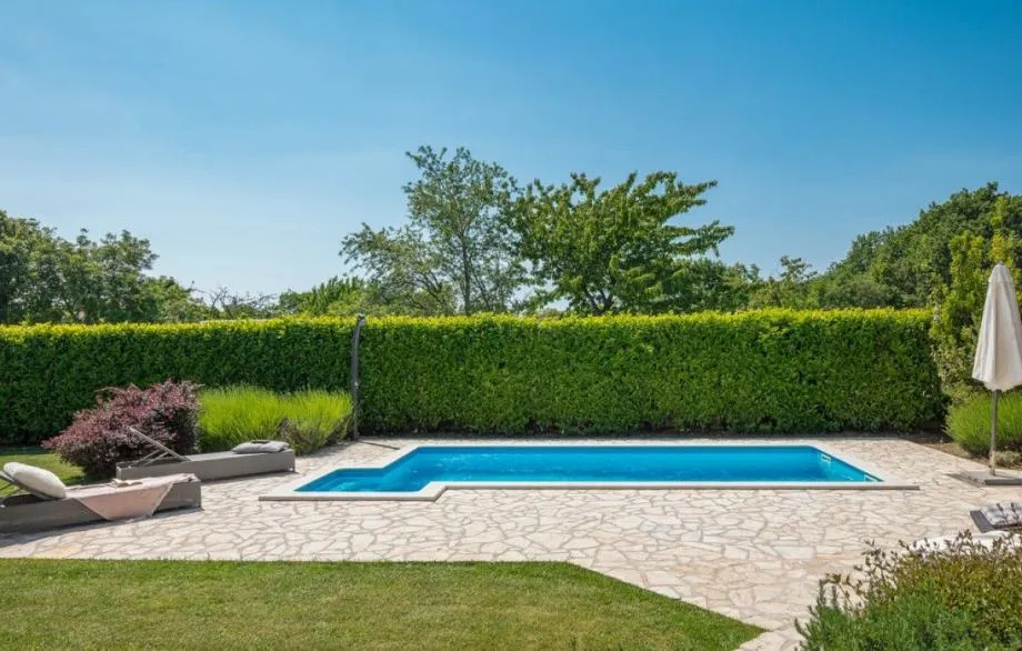 Vanjski prostor dizajniran je s posebnom pažnjom i uključuje natkrivenu ljetnu kuhinju, pogodnu za druženja na otvorenom. Dvorište ima bazen i sunčalište, što ga čini idealnim mjestom za opuštanje i uživanje u mediteranskom ugođaju.