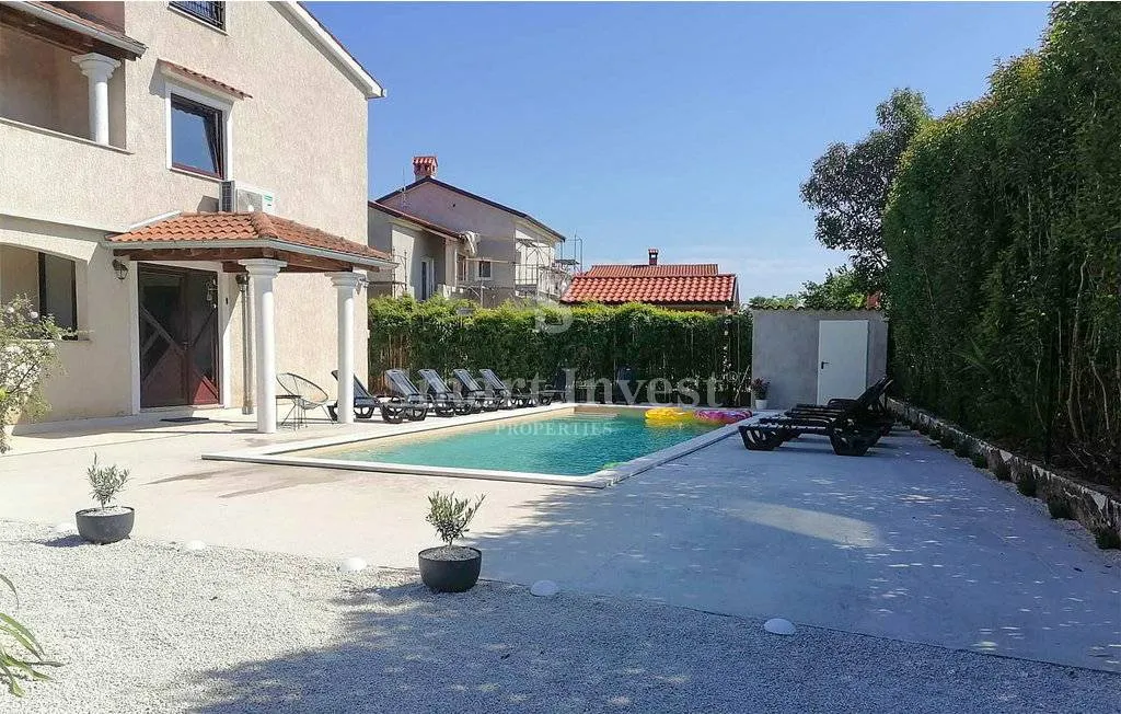 POREČ, prostrana kuća sa 3 apartmana i bazenom, 4 km od mora. Ova lijepa kuća površine 320 m2 smještena je na zemljištu površine 856 m2, ima 3 apartmana, ukupno 8 spavaćih soba i 5 kupaonica. Apartmani su povezani unutarnjim stubištem pa se kuća može koristiti kao jedna cjelina ili kao kuća s 3 odvojene stambene jedinice. U prizemlju je smješten komforan apartman 3S+DB – dnevni boravak s blagovaonicom i kuhinjom otvorenog tipa, 3 spavaće sobe, 2 kupaonice. Dnevni boravak i kuhinja imaju izlaz na prostranu natkrivenu terasu površine 30 m2 sa jacuzziem i lounge zonom. Na 1. katu je smješten komforan apartman 3S+DB – dnevni boravak s blagovaonicom i kuhinjom otvorenog tipa, 3 spavaće sobe, kupaonica, wc, te tri balkona. U potkrovlju je smješten apartman 2S+DB – dnevni boravak s blagovaonicom i kuhinjom, dvije spavaće sobe, kupaonica, te dva balkona s kojeg se pruža lijepi pogled na more. Na uređenoj okućnici se nalazi bazen od 40 m2, sunčalište, uređeni i ograđeni vrt, pomoćni objekt od 21 m2 (vrtna kućica), 3 parkirna mjesta. Kuća je smještena na mirnoj lokaciji i okružena prirodom i zelenilom. Udaljena je 4 km od mora i grada Poreča, 50 km od graničnog prijelaza i aerodroma (Portorož, Pula). Mirna i lijepa lokacija čini ovu nekretninu idealnom prilikom za sve koji traže lijepu prostranu i komfornu nekretninu koju je moguće prilagoditi kako za obiteljski život tako i za turističke svrhe. Za više informacija i razgled nazovite +385/91/320-0021 ID KOD AGENCIJE: 13219 Agencija Opatija Ovlašteni posrednik Mob: +385/99/320-0008 E-mail: office@smart-invest.hr www.smart-invest.hr