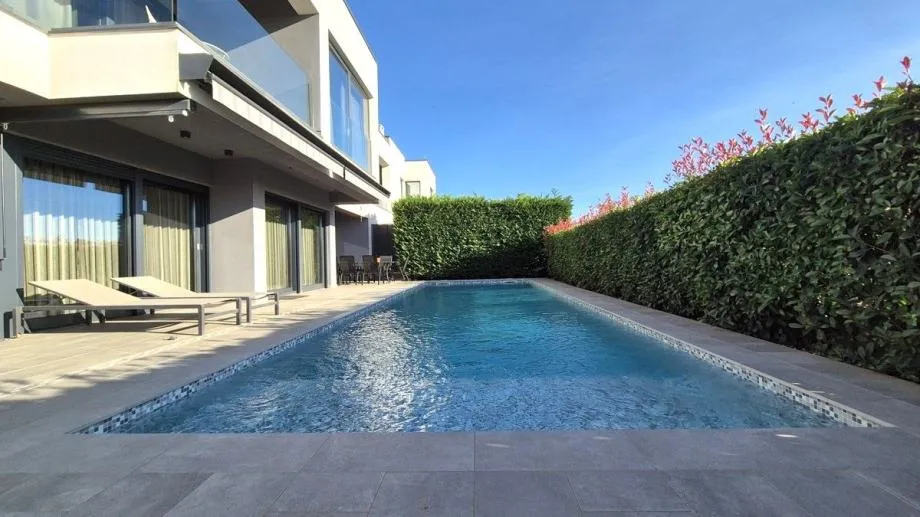 Vanjski prostor je očaravajući, s bazenom, roštiljem, terasom uz bazen, sunčalištem i dvije natkrivene terase. Velika krovna terasa nudi pogled na more, uz jacuzzi i wellness sadržaje poput saune, tuš kabine i dobro opremljenog fitness prostora u suterenu.
