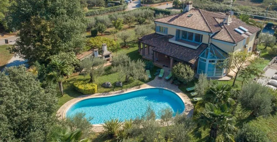 Prekrasna Vila u Poreču smještena u mirnome naselju okružena prirodom 1km od mora. Površine 420m2 koji se protežu na tri etaže. Nešto posebno i vrijedno nalazi se u podrumu kuće, tradicionalna istarska konoba u kojoj se nalazi mini kameni bar, velika blagovaona sa kaminom, opremljena kuhinja, toalet i vinski podrum u staklu. Konoba je povezana sa ostalim dijelom kuće te se tako stepenicama odlazi u prizemlje kuće. Sastoji se od dvije spavaće sobe i dvije kupaone sa tuš kabinama, prostrani dnevni boravak sa kaminom koji ima izlaz na zimski vrt i na dvorište kuće, u nastavku je blagovaona i kuhinja sa spremištem. Na prvome katu našle su se još tri spavaće sobe, jedna master sa izlazom na balkon koja ima vlastitu raskošnu kupaonu sa kadom i tuš kabinom i walk in closet. U hodniku kata se nalazi dodatan dnevni prostor koji može služiti kao radni prostor,mini teretana itd. sa izlazom na balkon. Na ulazu u drugu kupaonu smjestila se prostorija cijela opremljena ugradbenim ormarima što čini dodatan prostor za sve što je potrebno. Sve prostorije i spavaće sobe su klimatizirane,a grijanje je radijatorima na naftu. Spremište se nalazi u podrumu kuće. Kuća se prodaje u potpunosti namještena i opremljena.Iz prizemlja se izlazi na veliku natkrivenu terasu, dvorište od cca 1250m2, sunčalište i prekrasan bazen od 77m2.Oduševiti će Vas ovo lijepo uređeno zeleno dvorište ispunjeno biljkama i palmama koje daju poseban ugođaj. U dvorištu se još nalazi grill zona sa kaminom,krušnom peći i velikim kamenim stolom natkrivenim vinovom lozom, vanjsko spremište.