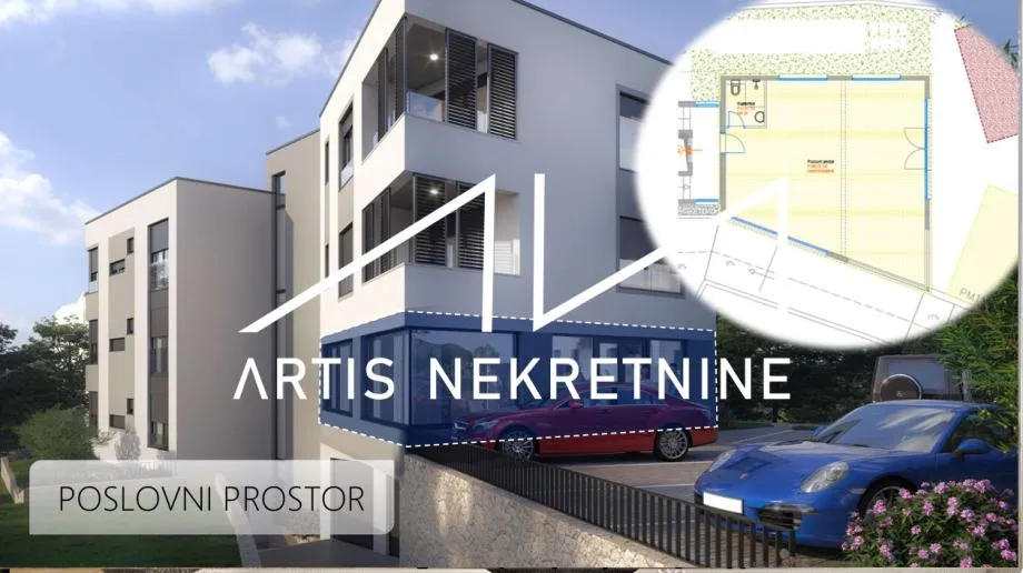 Poslovni prostor u prizemlju zgrade, s više parkirnih mjesta u prizemlju. Poslovni prostor nalazi se uz glavnu prometnicu te je sjeveroistočno orijentiran. Lokacija poslovnog prostora je iznimno atraktivna i prometna, a obzirom se u okruženju razvija sve više objekata, lokacija će u budućnosti sve više dobivati na vrijednosti.