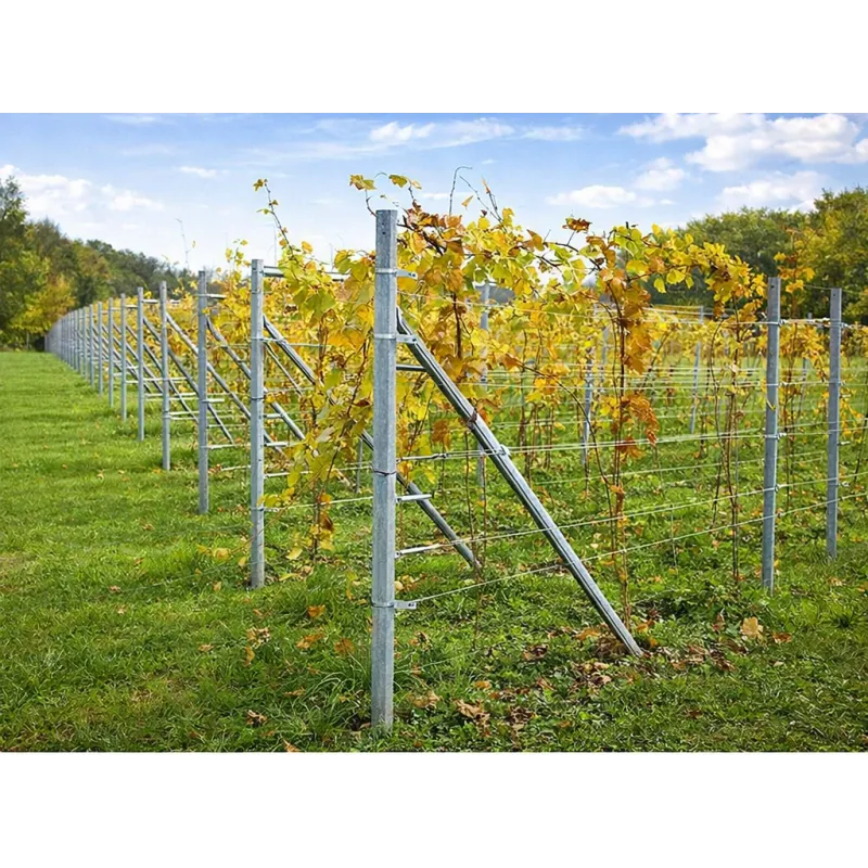 Potporni stup-metalni, pocinčani-v 2500 mm Potporni stup uključuje: -potporni stup-potopnu ploču-nosač potpore-vijčana roba Tehnički podaci -visina stupa: 2500 mm-širina: 63 mm-debljina: 43 mm-debljina lima: 1,5 mm Prednosti metalnih stupova u odnosu na betonske i drvene stupove: -velika čvrstoća i bočna stabilnost-otpornost na strojno branje-razmak između stupova u vinogradima do 6 m-razmak između stupova za ogradu do 2,5 m-brzo postavljanje zabijanjem u tlo-vijek trajanja preko 30 godina-jednostavna i potpuna reciklaža Stupovi su izrađeni iz pocinčanog ili crnog vruće cinčanog čeličnog lima.