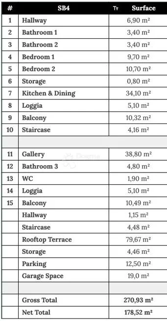 Na svega nekoliko koraka od mora, ova moderna zgrada s devet rezidencija donosi stanovanje prožeto svjetlom i jednostavnom elegancijom. Prostor je osmišljen tako da se unutarnji i vanjski život prirodno nadopunjuju, bilo kroz privatne vrtove prizemlja ili prostrane krovne terase na gornjim etažama. Penthouse SB4, dvoetažni stan neto površine 178,52 m², odlikuje se prostranošću i funkcionalnošću. Na prvoj razini nalazi se dnevni boravak s kuhinjom i blagovaonicom (34,10 m²) povezan s loggiom (5,10 m²) i balkonom (10,32 m²). Dvije spavaće sobe (9,70 m² i 10,70 m²), dvije kupaonice, spremište i hodnik zaokružuju tlocrt. Na gornjoj etaži, galerija (38,80 m²) stvara dodatnu dimenziju prostora – savršenu za radni prostor, studio ili lounge. Tu se nalazi i treća kupaonica, dodatni WC, loggia (5,10 m²) i balkon (10,49 m²). Vrhunac stana je krovna terasa od 79,67 m², privatno utočište za sunčane dane i večeri s pogledom na more. Stan uključuje spremište (4,46 m²), jedno vanjsko parkirno mjesto (12,50 m²) te garažno mjesto od 19,00 m². Ukupna bruto površina stana iznosi 270,93 m². Zgrada je već izgrađena, a završni radovi su u tijeku. Dostupna je i opcija potpuno opremljenog interijera. Kupac ne plaća porez na promet nekretnina. Izvođač zadržava pravo izmjene planova, materijala i značajki bez obveze ili prethodne obavijesti. Sve dimenzije, dizajni i materijali su približni i podložni promjenama prema odluci izvođača. Za sve informacije i dogovor oko razgledavanja, stojim na raspolaganju. Aurelija Kaniški 00385995472989 aurelija.kaniski@dogma-nekretnine.com ID KOD AGENCIJE: DA100065624 Aurelija Kaniški Agent s licencom Mob: 099/547-2989 Tel: 042/562-017 E-mail: aurelija.kaniski@dogma-nekretnine.com www.dogma-nekretnine.com