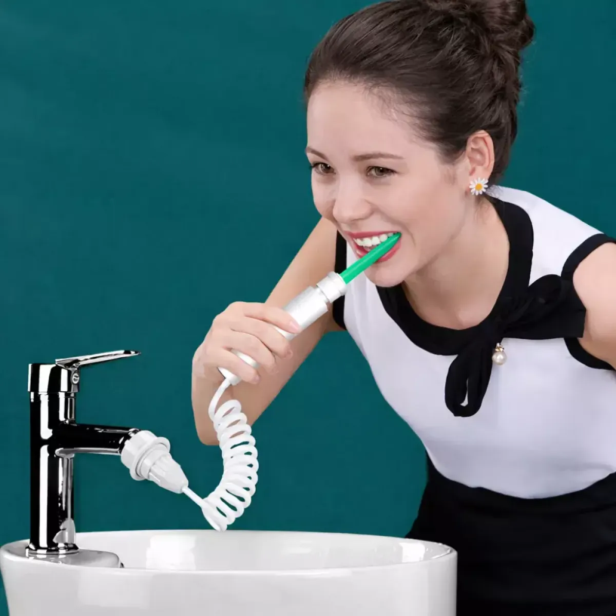 Ovaj praktični zubni irigator učinkovito uklanja ostatke hrane i zubne naslage s teško dostupnih mjesta između zubi i uz liniju desni. Idealan je dodatak svakodnevnoj oralnoj higijeni, posebno za osobe s aparatićima, implantatima ili osjetljivim desnima. Jednostavno se spaja izravno na slavinu, ne zahtijeva baterije ni električnu energiju te omogućuje snažan, ali istovremeno nježan mlaz vode za temeljito čišćenje. Zahvaljujući kompaktnom i laganom dizajnu, pogodan je i za putovanja.