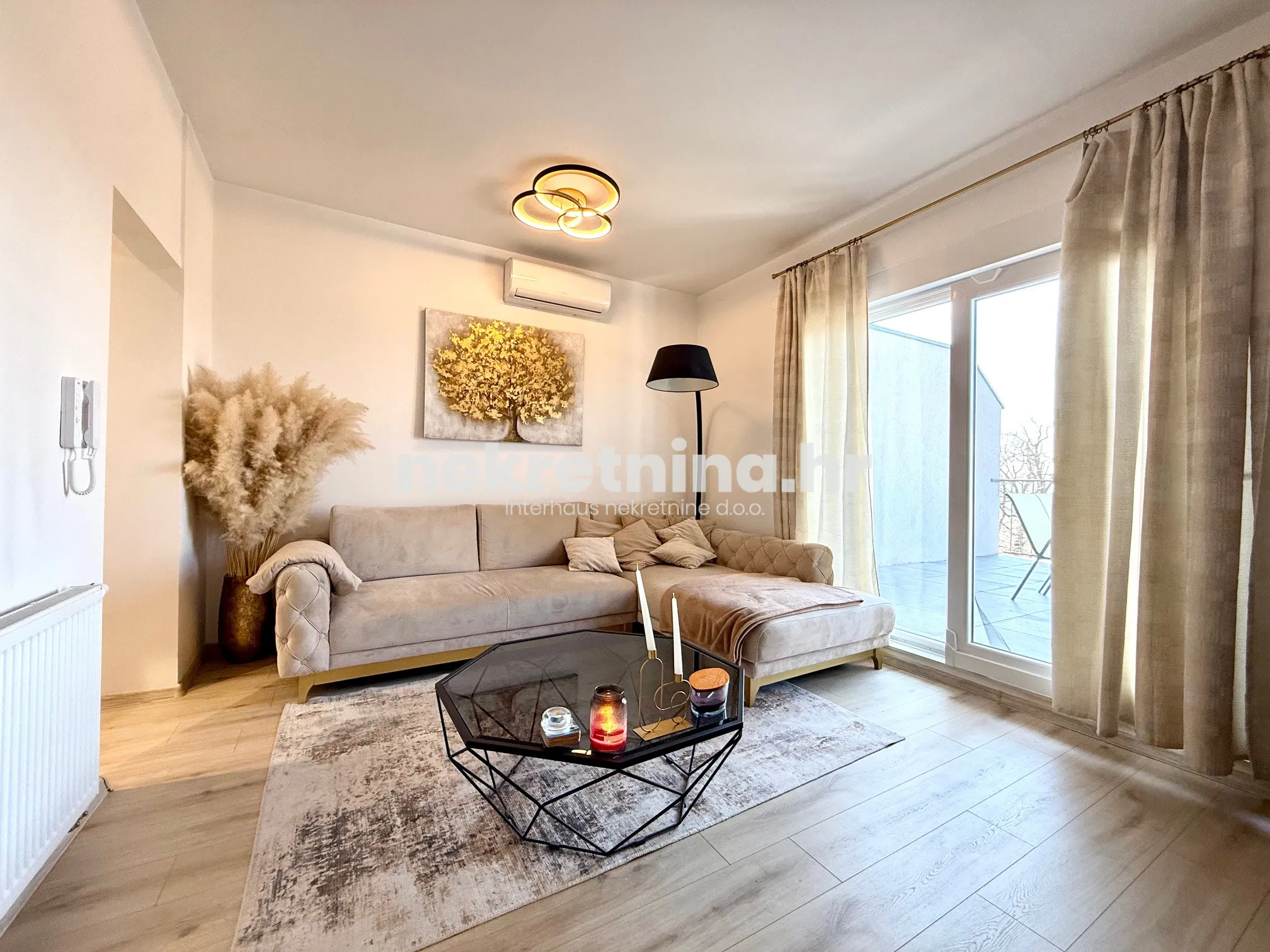 Nekretnina je potpuno namještena i uređena kvalitetnim materijalima, a zahvaljujući velikim otvorima i dobroj orijentaciji stan je vrlo svijetao i ugodan za boravak.