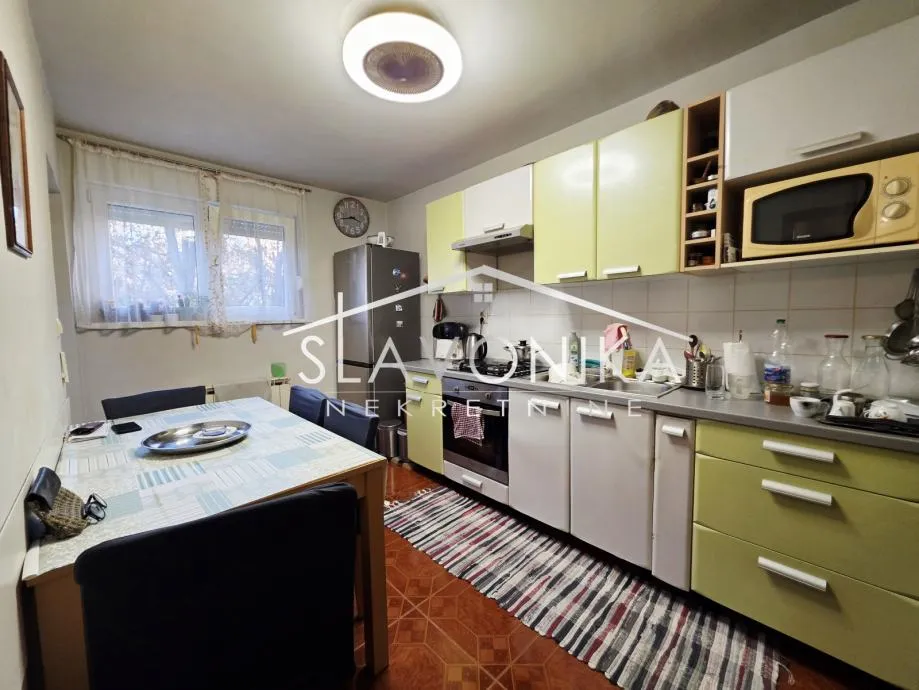 Uredan, djelomično namješten stan ( moguća kupnja i potpuno namještenog ) koji se sastoji od hodnika koji vodi ka toaletu sa kupaonicom u lijevoj strani, te se ispred nalazi ostava. Iz hodnika u desnoj strani imamo prostranu spavaću sobu, dok je također u desnoj starni ispre dnevna soba, sa izlazom na prostranu loggiu. Pravo iz hodnika nalazi se kuhinja sa blagovaonicom, koja također izlazi na balkonsku terasu.