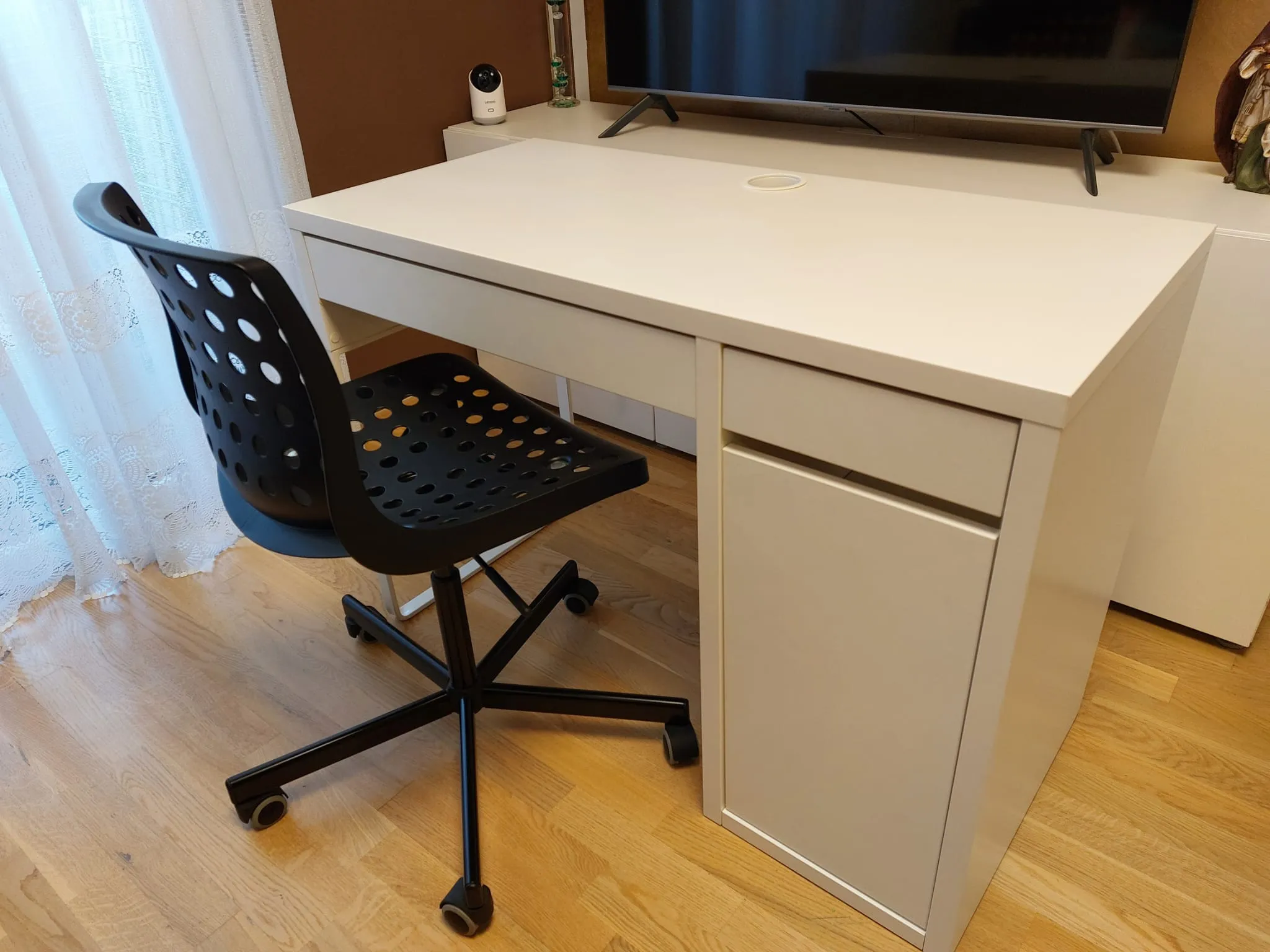 Stol: 105x50x75 cm, bijeli, 2 ladice, vrata, 3 police, može se montirati na obje strane, otvor za kablove.