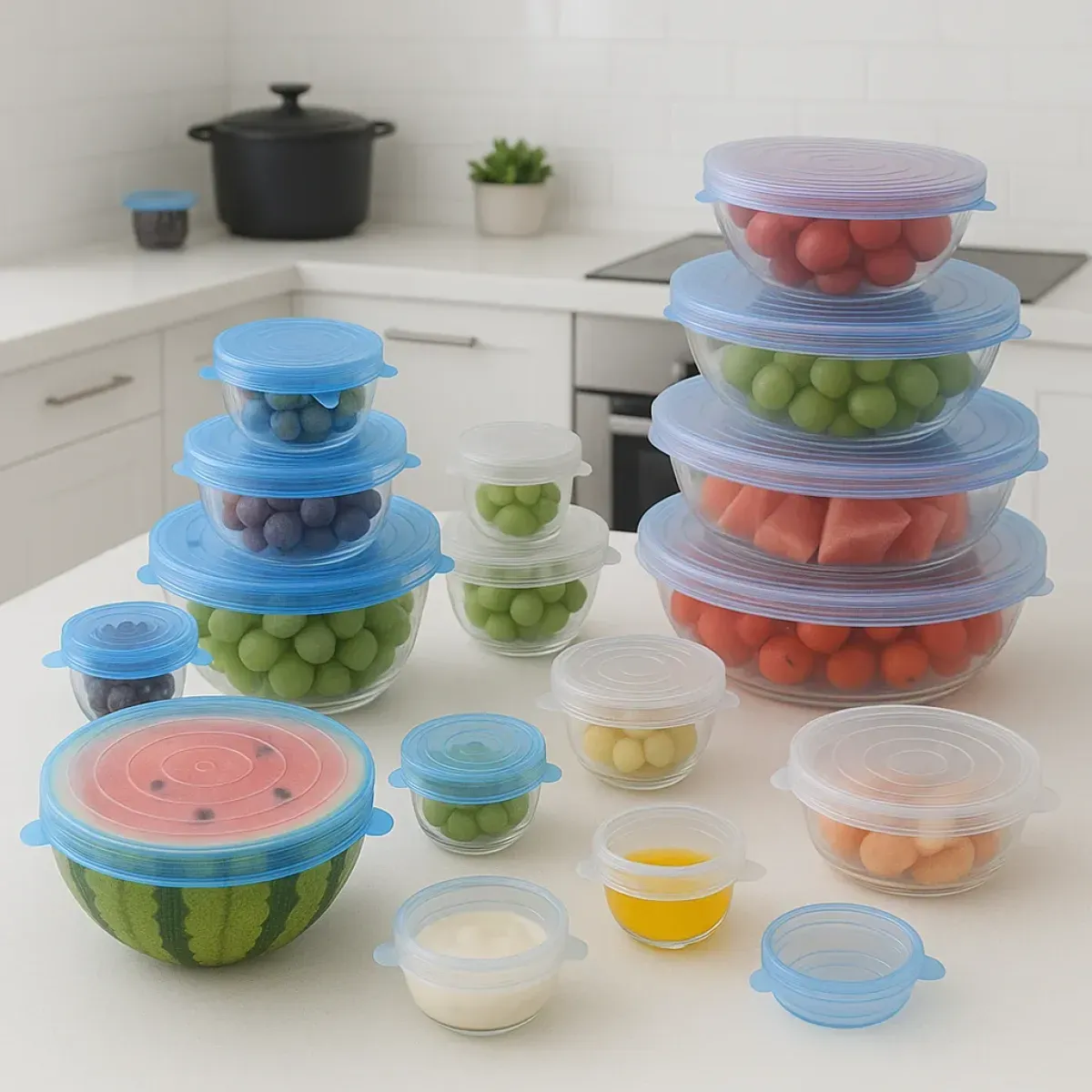 Odaberite odgovarajući poklopac, rastegnite ga i stavite na željenu posudu. Posuda je hermetički zatvorena!