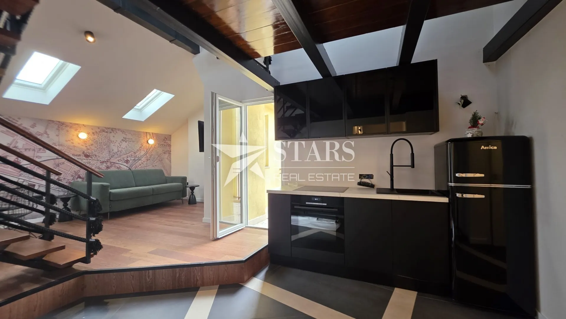 Stan ima 28 m² i raspoređen je na dvije etaže. Na donjoj etaži nalaze se spavaća soba, kupaonica, spremište te dnevni boravak s kuhinjom i izlazom na balkon. Balkon nudi otvoren pogled na grad i more. Unutarnje stepenice vode na galeriju koja služi kao dodatni prostor za rad ili odmor.