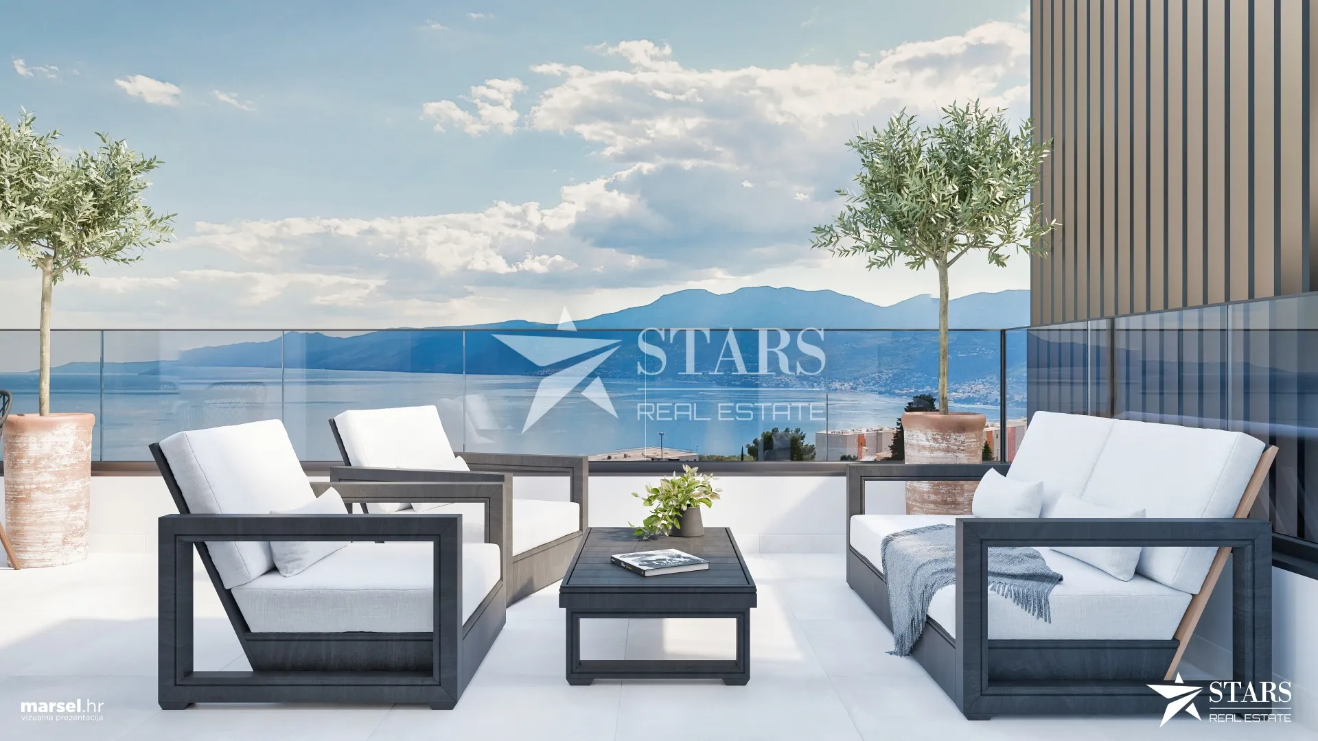 Prostrani balkon pruža panoramski pogled na more i kvarnerske otoke, što dodatno naglašava vrijednost ove nekretnine.