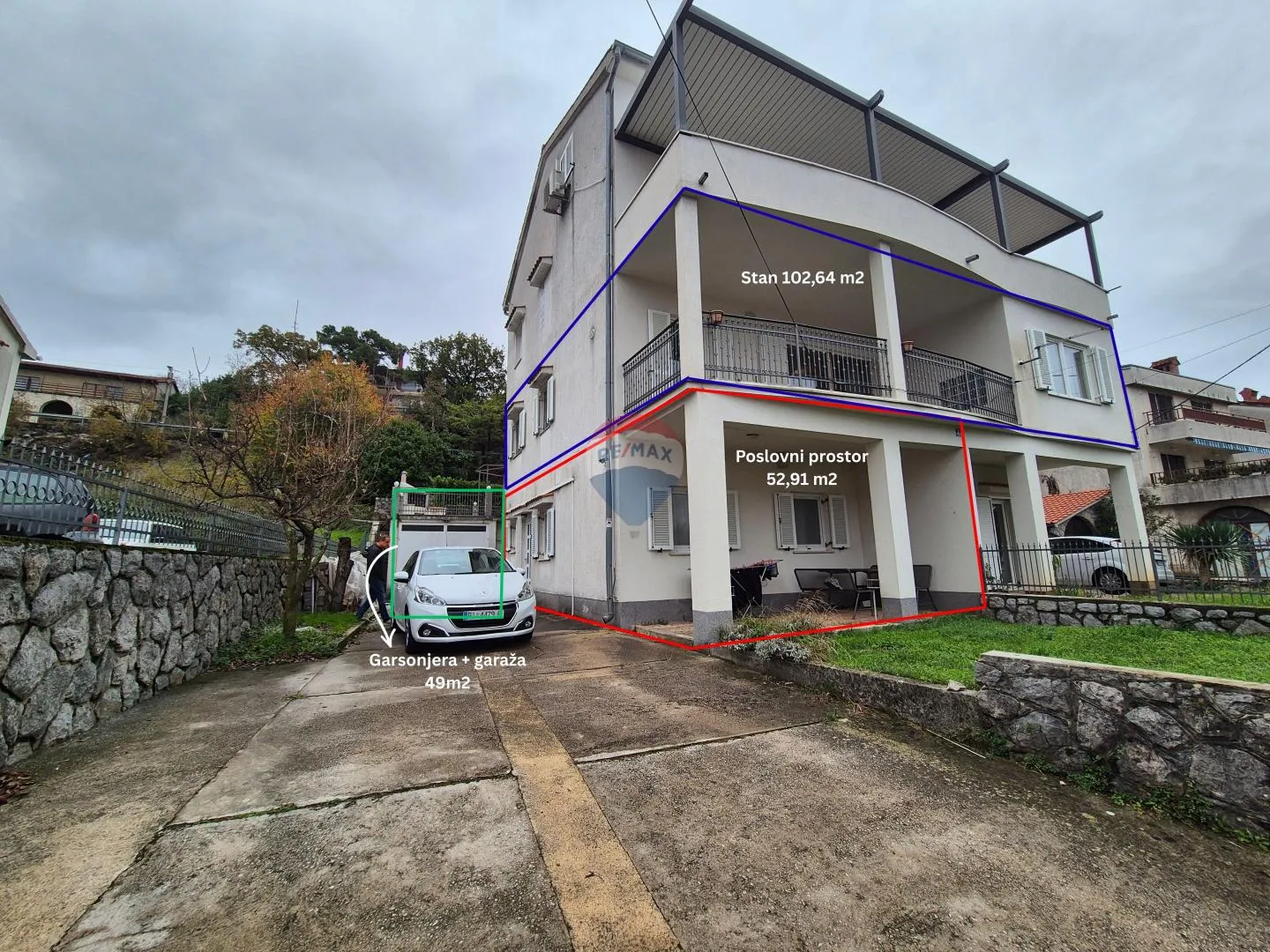 RE/MAX centar nekretnina iz svoje ponude izdvaja za prodaju 3 jedinice (stan + poslovni prostor + kuća, sveukupne kvadrature 204, 55 m2) + garažu + dvorište 163 m2. Navedeno se nalazi na Martinkovcu, na mirnoj lokaciji u slijepoj ulici. Stan i poslovni prostor su etažirani dok dvorišna kuća ima svoj zaseban vlasnički list. Prodaje se isključivo kao cjelina. Stan 102,64 m2 se nalazi na prvom katu kuće, ima zaseban ulaz, prostire se preko cijele etaže i ima djelomičan pogled na more. Sastoji se od: 3 spavaće sobe (glavna spavaća soba ima svoju vlastitu kupaonicu i walk in ormar), još jedne kupaonice, dnevnog boravka s kuhinjom, blagovaonom i radnim dijelom u open space konceptu s izlazom na balkon i pogledom na more, vešeraja/praone i hodnika. Stan ima kamin na drva, 3 klima uređaja te mramorne ploče na struju. Kompletno je namješten i opremljen i kao takav se prodaje. Poslovni prostor 52,91 m2, nalazi se u prizemlju iste te kuće i ima svoj zaseban ulaz. Trenutačno je uređen kao 1S+DB stan koji je u dugoročnom najmu, a sastoji se od: 1 spavaće sobe, dnevnog boravka s kuhinjom i blagovaonom, kupaone, hodnika i natkrivene terase s izlazom u vrt. Grijanje i hlađenje je putem klime te mramornih ploča na struju. Kompletno je namješten i opremljen i kao takav se prodaje. Predmet prodaje je i manja dvorišna kuća 49 m2, a koja je trenutačno podijeljena na garažu i garsonijeru koja je također dugoročno iznajmljena (uz manje preinake može se dobiti 1S+DB stan). Na krovu garaže i garsonijere se cijelom tlocrtnom površinom prostire velika terasa sa sjenicom i zidanim kaminom. Grijanje i hlađenje u garsonijeri je putem klima uređaja i mramornih ploča. Kompletno je namještena i opremljena i kao takva se prodaje. Sve navedeno nalazi se u dvorištu 163 m2, koje je kompletno ograđeno i na kojem se osim ranije navedenog nalazi vrt, vanjsko spremište i više parkirnih mjesta. Idealna nekretnina za veću obitelj, za investiciju u vidu iznajmljivanja ili kombinaciju iznajmljivanja i rješavanja vlastitog stambenog pitanja. ID KOD AGENCIJE: 300421024-876 Vjeran Šaina Prodajni predstavnik Mob: +385 91 641 7001 Tel: +385 51 551 871 Licenca: 191/2019 E-mail: v.saina@remax-opatija.hr remax-centarnekretnina.com