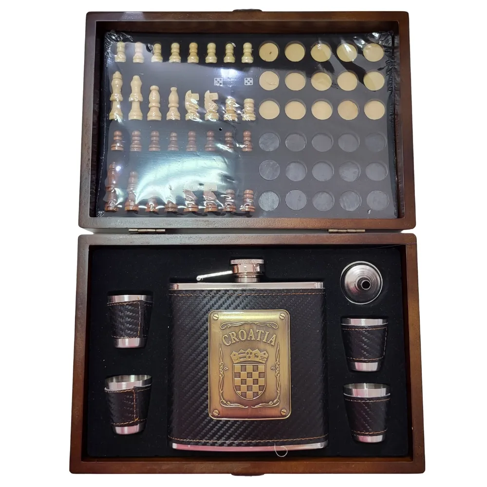 Šah set sadrži šahovnicu, figure za šah i druge društvene igre, pljosku Croatia i čašice s grbom. Dimenzije je 28x19cm.