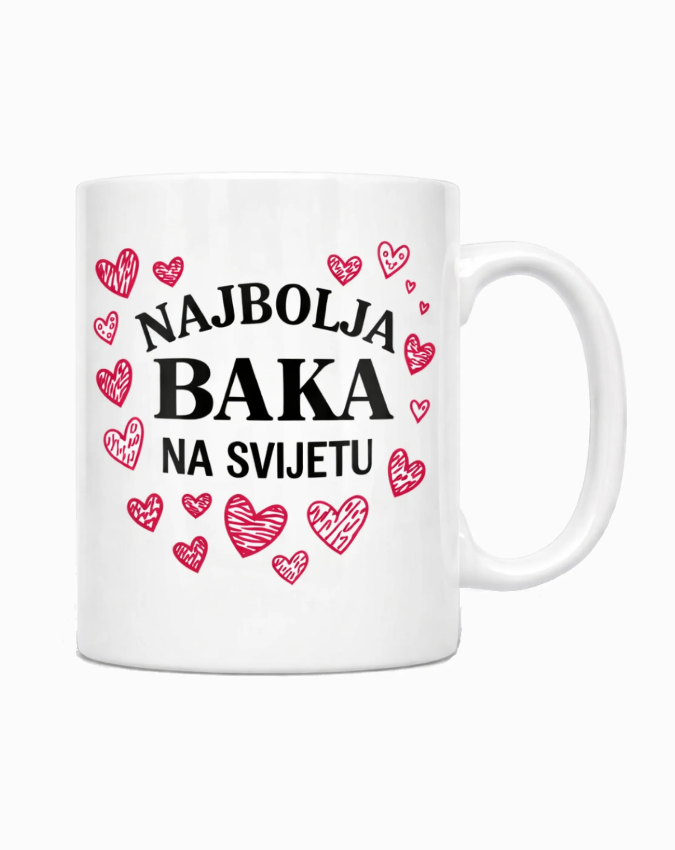 Minimalistički, ali upečatljiv dizajn u kombinaciji crnog natpisa i crvenih srca čini je idealnom za svakodnevnu kavu ili čaj, a svaki gutljaj podsjećat će baku koliko je voljena.