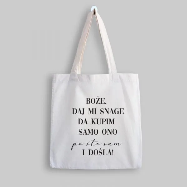 Šopingholičari, a i oni koji to nisu, oduševit će se ovom vrećicom modernog dizajna sa šaljivom porukom. Jer nije ona samo obična vrećica, već ima šaljivu poruku na sebi ” Bože, daj mi snage da kupim samo ono pošto sam i došla!”.