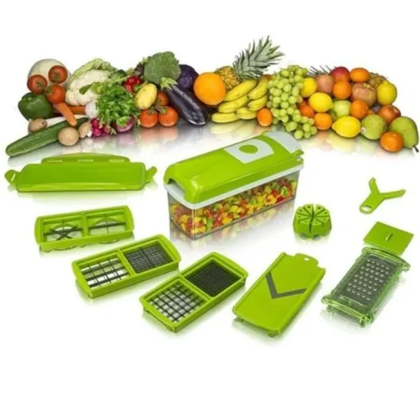 Samo jednim pritiskom možete narezati voće, povrće ili sir na čak 11 različitih oblika: kockice, rezance, kriške, štapiće. Sjeckalica ima čak 7 nastavaka, a uz to ćete dobiti ipločicu za rezanje sa zaštitnim poklopcem, umetak s rešetkama i držač hrane.