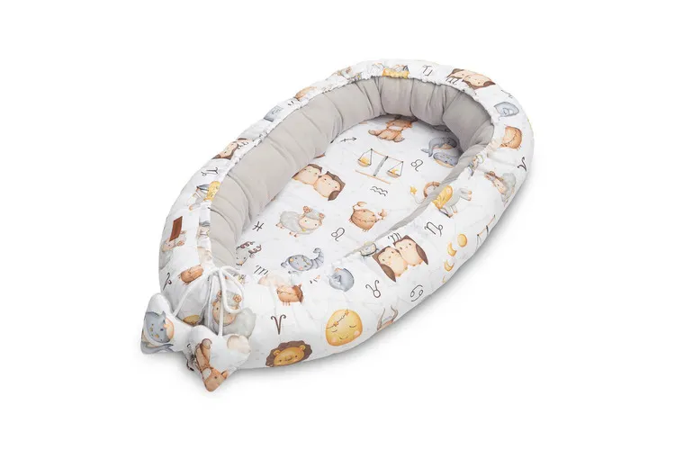 Gnijezdo za bebe je dizajnirano za bebe od rođenja do otprilike 6 mjeseci starosti. Čahura obavija bebu i ograničava joj prostor, zahvaljujući čemu se beba osjeća sigurno, kao u majčinom trbuhu. Može se koristiti na više načina: u roditeljskom krevetu, na kauču, u krevetiću i tijekom putovanja. Visoki zidovi sprječavaju da se dijete kotrlja. Proizvod je izrađen od pamuka i muslina punjen 100% silikonskim kuglicama. PAŽNJA! Gnijezdo za bebe nije namijenjeno za nošenje ili podizanje djeteta! Održavanje: Ručno pranje. Maksimalna temperatura pranja je 30O C. Ne koristite izbjeljivač. Perite u blagom deterdžentu ili deterdžentu u boji. Ne čistite kemijski Glačajte samo pamučni sloj na temp. 110O C. max. Ne sušiti u sušilici