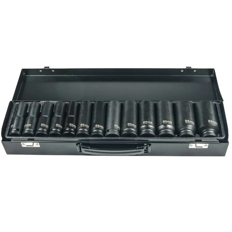 set od 13 dugih 1/2" šesterokutnih udarnih ključeva u veličinama 10 - 30 mm smještenih u metalnu transportnu kutiju