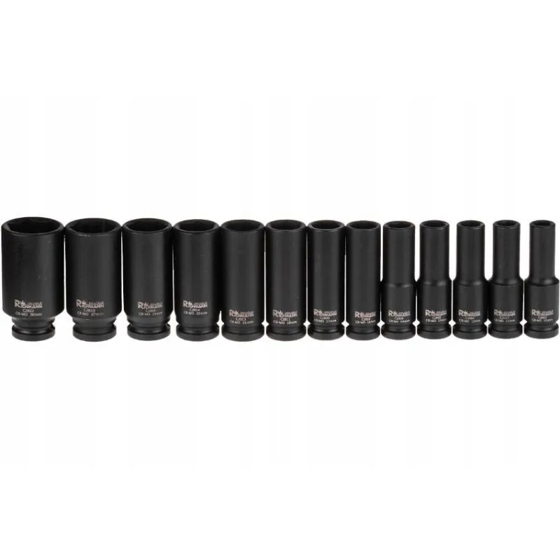 set od 13 dugih 1/2" šesterokutnih udarnih ključeva u rasponu veličina od 10 - 30 mm smještenih u metalnu torbu za nošenje