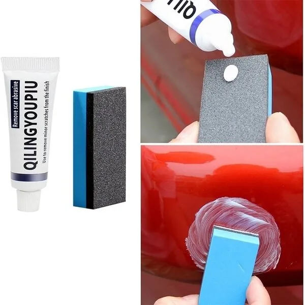 Tuba sa 15ml specijalne paste za popravak oštećenja. Pasta je mješavina abrazivnog materijala, površinski aktivnog sredstva i sredstva za punjenje. Napravljena je tako da ne oštećuje lak, a odstranjuje blage ogrebotine, ostatke boje drugog vozila, katran, ljepilo i sl.