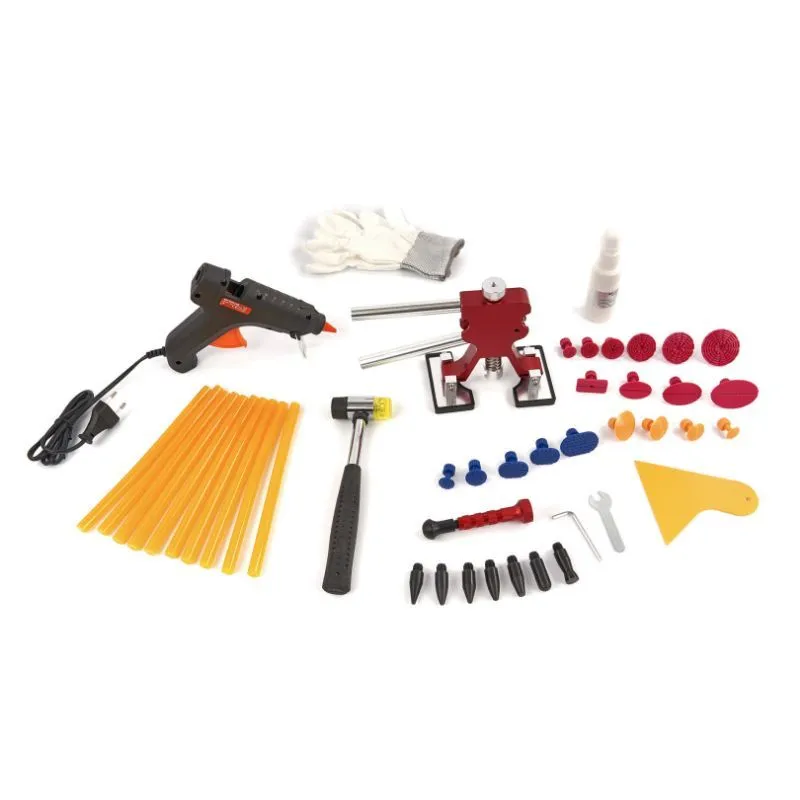 set sadrži sve potrebne alate za glačanje manjih i većih udubljenja brzo i bez oštećenja. Sjetite se samo čekića, kompleta rukavica, pištolja za ljepilo i još mnogo toga.