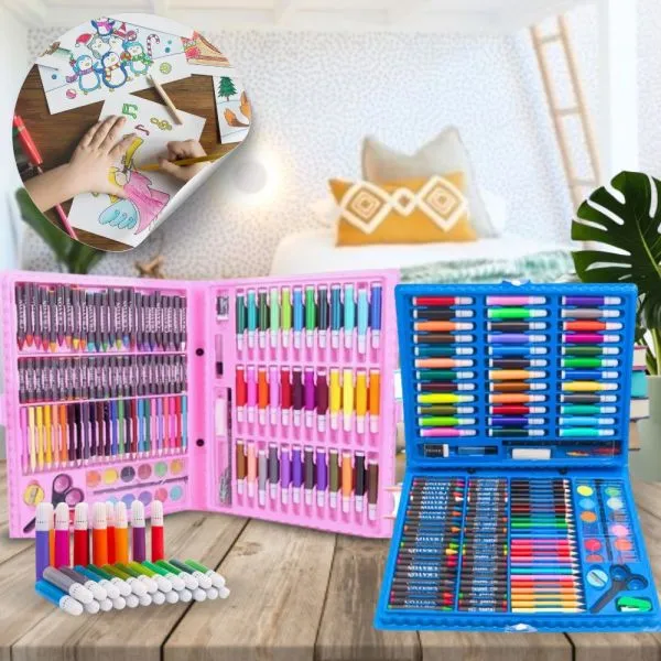 150 komada različitih umjetničkih alata uključujući bojice, markere, pastelne bojice, akvarele, škare, ravnalo, gumicu i još mnogo toga.