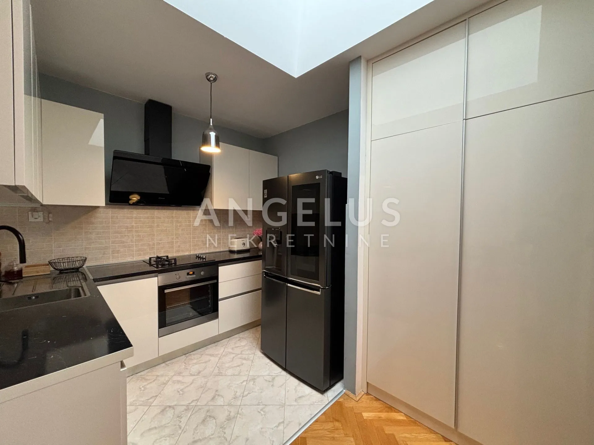 A modernly decorated and superbly equipped three-bedroom apartment is for sale, with a total gross area of 79 m, while the net area of the apartment is 110 m2, located on the second floor in the attic, facing south. The apartment consists of: kitchen, living room and dining room, hallway, three bedrooms, toilet and bathroom, total net usable area of 72.65 m2, with a terrace of 24.90 m2 and an outdoor parking space of 12.50 m2. From the dining room and kitchen you can access a beautiful terrace, facing south, ensuring plenty of sun and light throughout the day. The apartment is equipped with the highest quality materials and designed to create an elegant ambiance.