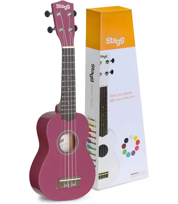 Ljubičasti soprano ukulele sa gornjom, stražnjom i bočnim pločama od lipe, u najlonskoj torbi.