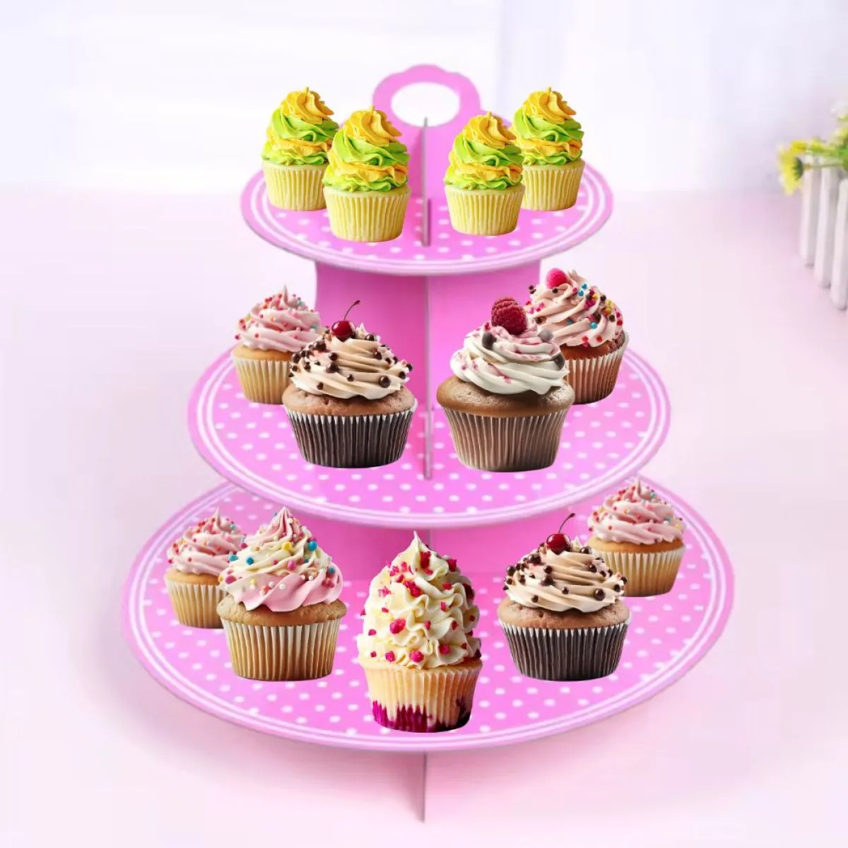 Ovaj kartonski stalak za kolače s tri kata idealan je dodatak za posluživanje vaših omiljenih slastica, uključujući muffine, cupcakes ili male kolače. Savršen za proslave, rođendane, vjenčanja ili druge posebne prigode, ovaj stalak omogućava da vaša prezentacija izgleda profesionalno i privlačno. Izrađen od kvalitetnog kartona, jednostavan je za montažu i dolazi u veselim bojama poput roze s točkicama, dodajući šarm i boju svakom stolu.