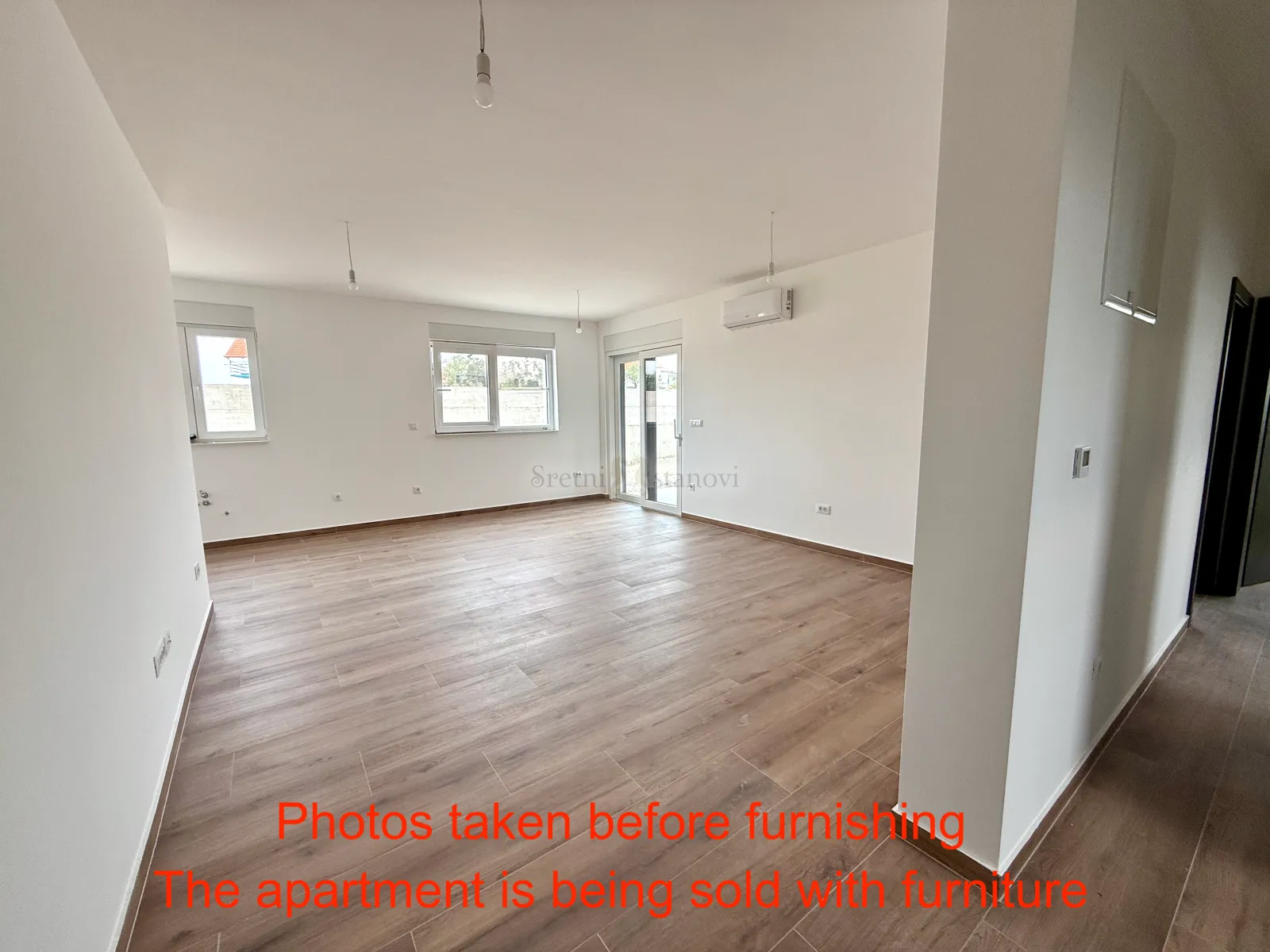 Prodaje se prekrasan, novonamješteni stan u novogradnji u gradu Vodice, u blizini svih sadržaja potrebnih za ugodan život - trgovine, ugostiteljski objekti, supermarketi. Do centra grada Vodice i mora ima oko 3 minute vožnje, to jest oko 12 minuta hoda, do plaže Male Vrulje oko 4 min vožnje (oko 18min hoda), a Plave plaže oko 5 min vožje (oko 20 min hoda). Osnovna škola je na oko 3 minute vožnje (oko 10 minuta hoda), a vrtić se nalazi na oko 5 minuta vožnje (oko 20min hoda). Stan se nalazi u manjoj, modernoj zgradi - novogradnji iz 2026. godine. Stan se prodaje zajedno s potpuno novim i nekorištenim namještajem, a koji će biti dostavljen i namontiran u stanu početkom lipnja 2026. godine. Ovaj stan Vodice sastoji se od ulaznog hodnika, 2 spavaće sobe, kupaone, WC-a, spremišta i velikog dnevnog boravka s kuhinjom i blagovaonom te izlazom na lijepu natkrivenu terasu od 8.13m2. Terasa se širi u veliko dvorište ukupne površine 167,45 m2 koje se može iskoristiti u razne namjene - ljetna kuhinja i grill, jacuzzi kada, bazen, dječje igralište, dodatna parking mjesta, vrt... Kroz cijeli stan prolazi podno grijanje, a sve sobe su i klimatizirane. Rolete s elektro podizačima na svim prozorima, bojler 80L, visokokvalitetna keramika, videoportafon. Stanu pripada i jedno označeno, privatno vanjsko parkirno mjesto u okućnici zgrade, a moguće je napraviti dodatna parkirna mjesta u privatnoj okućnici stana. A, A+ energetski certifikat. Uredno vlasništvo i papiri gradnje. __ ENG A beautiful, newly furnished apartment is for sale in a modern new development in the town of Vodice, located close to all amenities necessary for comfortable living – shops, cafés, restaurants, and supermarkets. The town center of Vodice and the sea are approximately a 3-minute drive away (around a 12-minute walk). Male Vrulje Beach is about a 4-minute drive (approx. 18-minute walk), while Plava Beach is about a 5-minute drive (approx. 20-minute walk). The primary school is about a 3-minute drive (10-minute walk), and the kindergarten is approximately a 5-minute drive (20-minute walk). The apartment is located in a smaller, modern residential building – a new development completed in 2026. The apartment is sold fully furnished with brand-new, unused furniture, which will be delivered and installed in the apartment by June 2026. This apartment in Vodice consists of an entrance hallway, two bedrooms, a bathroom, a separate WC, a storage room, and a spacious open-plan living room with kitchen and dining area, with access to a lovely covered terrace of 8.13 m². The terrace extends into a large private garden with a total area of 167.45 m², which can be used for various purposes such as a summer kitchen and barbecue area, jacuzzi/pool area, children's playground, additional parking spaces, or a garden. The apartment features underfloor heating throughout the whole apartment, and all rooms are air-conditioned. Additional features include electric roller shutters on all windows, an 80 L boiler, high-quality ceramics, and a video intercom system. The apartment also includes one designated private outdoor parking space within the building’s courtyard, with the possibility of creating additional parking spaces within the private garden area. The property has an A / A+ energy certificate. Ownership is clear, and all construction documentation is in order. ID KOD AGENCIJE: 7848 Andrea Zeneral Mob: 099 673 1949 Tel: 051/301-502 E-mail: andrea@sretnistanovi.hr www.sretnistanovi.hr