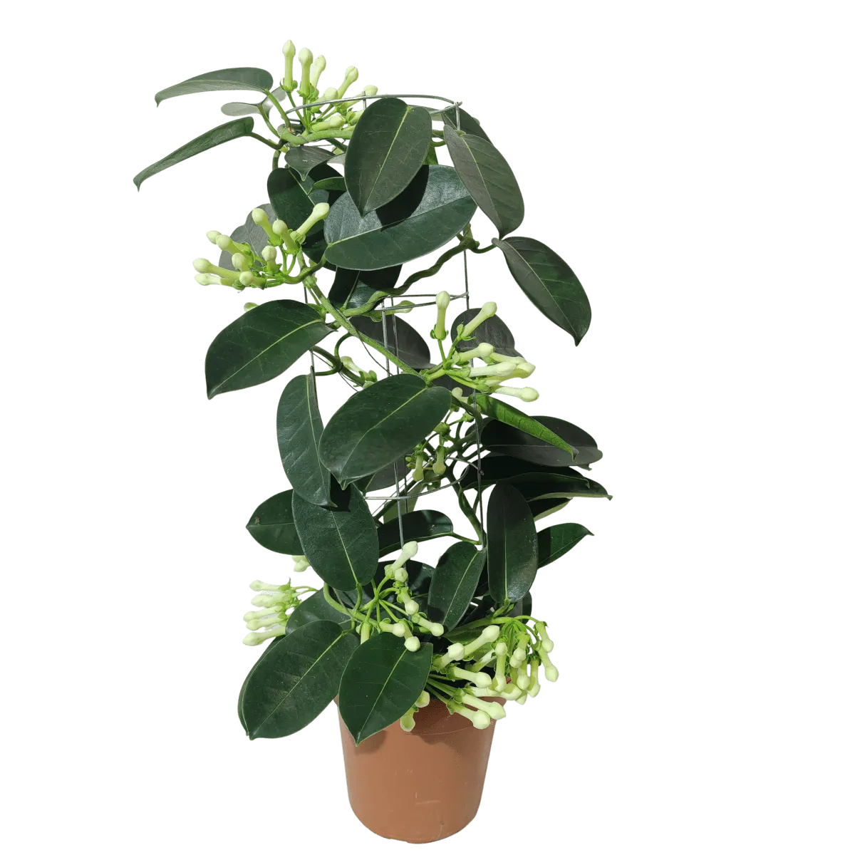 Opis biljke: Stephanotis floribunda je zimzelena penjačica koja može narasti do visine od oko 2 do 3 metra. Listovi su tamnozeleni, sjajni i kožasti, a cvjetovi su bijeli, cjevasti, zvjezdastog oblika i imaju slatki miris.