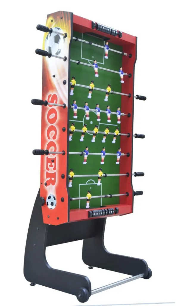 STOLNI NOGOMET 121x61x81cm CRVENI - MDF presvučen elastičnim laminatom, - teleskopske, sigurne ručke, - mogućnost okomitog preklapanja stola radi uštede prostora kada se stol ne koristi (dodatni kotačići za transport), - ručke izrađene od perforiranog materijala, minimaliziraju klizanje ruku, - igrači se dodatno šire na mjestu udarca lopte, - pažljivo podešene vodilice - dječak - ručke koje ne blokiraju i glatko se kreću, - blokiranje maksimalnog zamaha ručke, - vodilice pričvršćene gumenom podlogom, - rupe za bacanje loptica postavljene s obje strane stola, - stabilne i čvrste noge, dodatno ojačane prečkama, - dvije lopte, - dva ručna brojača za brojanje postignutih golova. Dimenzije: -ukupna dužina 121cm, - ukupna širina 60cm, - visina od poda do najviše točke 80 cm, - širina gola 20cm, - visina gola 5cm, - visina nogometne lopte 10,5 cm, - promjer kuglice 3 cm, - dužina terena 105cm, - širina terena 58 cm, - visina stola 160cm Pogledaj više: https://sarenikutak.hr/trgovina/igracke-djeca-i-bebe/igracke/drustvene-igre/stolni-nogomet-121x61x81cm-crveni/