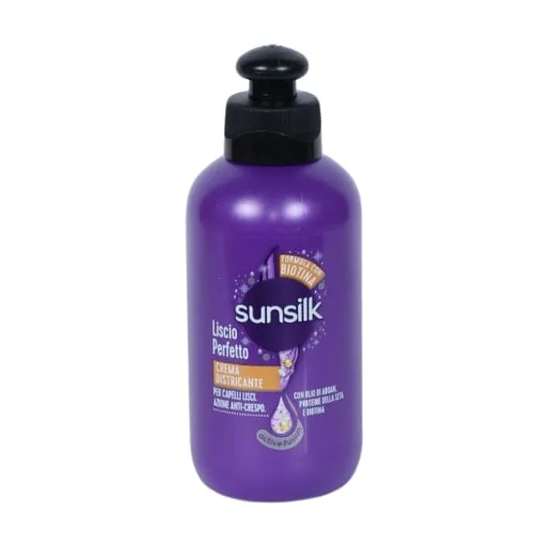 Perfect Straight tvrtke Sunsilk je krema za raščešljavanje koja poravnava vlakna vlasi jedno po jedno za savršeno ravnu, dugotrajnu, svilenkastu kosu punu vitalnosti. Formula je obogaćena čarobnim triom sastojaka: ulje makadamije, poznato po tome što hrani i bori se protiv kovrča; Elastin, poznat po tome što hidratizira i čini kovrče elastičnijim i definiranijim te konačno biotin, važno za vidljivo zdravu kosu.