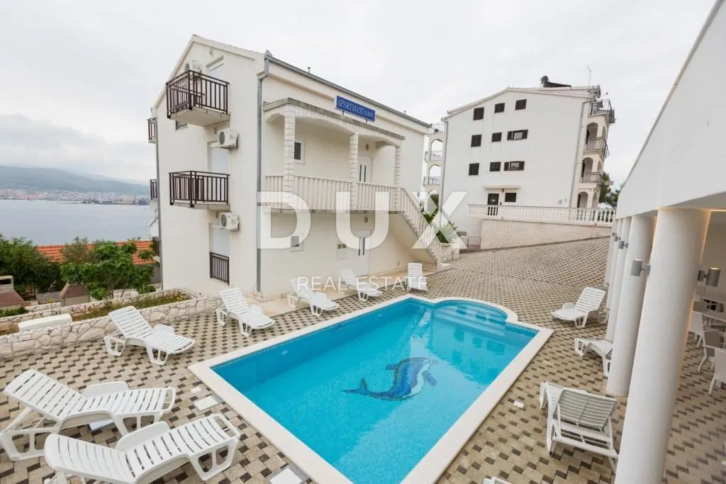 TROGIR, ČIOVO - Prostrana apartmanska kuća u blizini mora Prodaje se prostrana apartmanska kuća sa 7 zasebnih apartmana u mjestu Okrug Donji na otoku Čiovu. Objekt ukupne površine 327 m2 izgrađen je na parceli od 678 m2, a smješten je na atraktivnoj lokaciji udaljen od mora svega 120 m. Sastoji se od prizemlja, dva kata i potkrovlja. U prizemlju se nalazi manji jednosobni apartman, a na prvom katu su smještena dva dvosobna apartmana. Na drugom katu koji je tlocrtno identičan prvom nalaze se još dva dvosobna apartmana. U potkrovlju se nalaze dva jednosobna apartmana. Svi apartmani su klimatizirani. U dvorištu objekta dostupan je privatni parking sa sedam parkirnih mjesta, grijani bazen i sunčalište, te ostava. Na fasadi je termoizolacija, a oko objekta su postavljene kamene ploče i stepenište od bračkog kamena. Stolarija je PVC, a za podne obloge korišteni su parketi i keramičke pločice. Ovaj objekt s već uhodanim turističkim poslovanjem predstavlja vrhunsku investiciju u turizmu. Otok Čiovo ujedno je i produžetak grada Trogira s kojim je spojen pokretnim mostom. Na Čiovu se nalaze brojni zaljevi i skrivene plaže s kristalno čistim morem. Grad Trogir, s druge strane, povijesni je gradić s mnoštvom očuvanih kulturno-povijesnih spomenika iz antičkog te ponajviše iz srednjovjekovnog doba. Stara gradska jezgra Trogira proglašena je i svjetskom kulturnom baštinom pri UNESCO-u. Najbliža zračna luka udaljena je 6 km, a 25 km južnije nalazi se grad Split, kulturno i administrativno središte Središnje Dalmacije. Poštovani klijenti, agencijska provizija naplaćuje se u skladu s Općim uvjetima poslovanja www.dux-nekretnine.hr/opci-uvjeti-poslovanja ID KOD AGENCIJE: 33887 DUX Nekretnine Mob: +385 91 480 8808 Tel: +385 99 640 8438 E-mail: info@dux-nekretnine.hr www.dux-nekretnine.hr