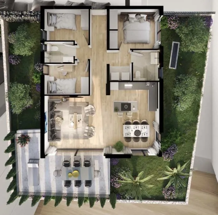 Spacious three-bedroom ground-floor apartment with a large private garden, underground garage, and additional outdoor parking