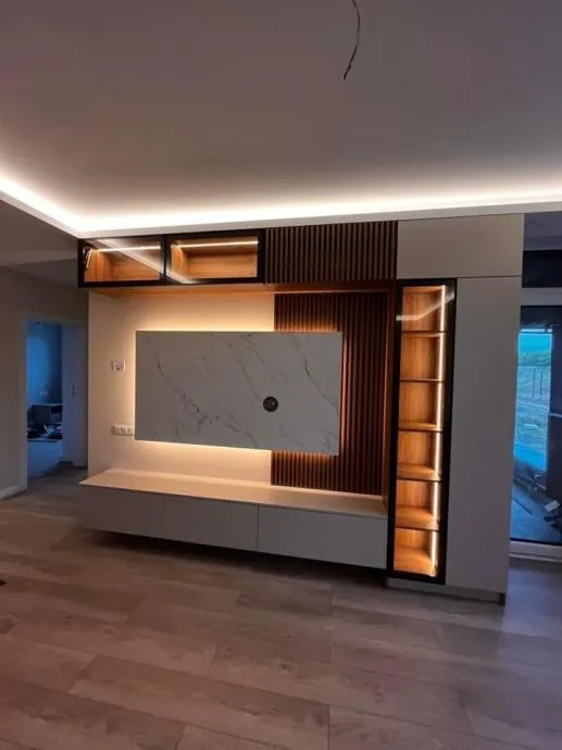 TV komoda sa zidnim panelom vitrinom