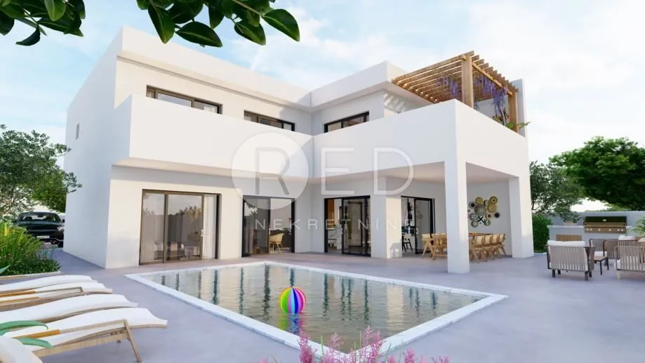 VILLA OTOK PAG - ROH BAU Prodaje se villa površine 278 m² okružena zelenilom. Villa se nalazi na mirnoj lokaciji u gradu Pagu te je u blizini svih bitnih sadržaja, a istovremeno pruža potpunu privatnost i relaksaciju. Nalazi se u neposrednoj blizini glavne ceste, 300 m udaljena od centra grada te 350 m udaljena od mora. Smještena je na uređenoj i ograđenoj čestici površine 594 m² na kojoj se s prednje strane nalazi bazen površine 28 m², prostrana terasa za sunčanje i opuštanje te prostor za roštiljanje. Iza kuće su 4 parkirna mjesta s predviđenim prostorom za punionicu električnih automobila. Vila je dvoetažna, a sastoji se od prizemlja, kata te ima ravni krov a glavni ulaz u kuću je direktno s parkinga. U prizemlju je smještena kuhinja s blagovaonicom i dnevnim boravkom, prostrana soba s kupatilom, ostava, zaseban wc, prostor za saunu i teretanu te vanjska ostava sa zasebnim ulazom. Dnevni dio i soba imaju izlaz na prostranu terasu, te odmaralište s bazenom. Unutarnje stubište vodi na prvi kat gdje se nalaze 3 prostrane sobe s kupaonicama, jedna od njih je glavna soba površine 30 m² koja po želji kupca nudi razne mogućnosti, npr ugradnja unutarnje masažne kade ili walk in ormar. Sobe imaju izlaz na prostranu zajedničku terasu. Na terasi je predviđen prostor za vanjski jacuzzi. Osim soba na katu se nalazi praonica s ostavom i tehnička prostorija. Grijanje i hlađenje objekta predviđeno je tzv. multi split klima uređajem, koji se sastoji od jedne vanjske i više unutarnjih jedinica, raspoređenih po prostorijama vile. U dnevnom boravku se nalazi dimnjak koji omogućava ugradnju kamina kako bi se upotpunio ugođaj u hladnijim zimskim mjesecima. Vila je u fazi izgradnje što omogućava kupcu odabir završnih materijala po vlastitoj želji kao i estetsko uređenje. ID KOD AGENCIJE: 436 Lucija Obad Asistent Agenta Mob: 0911104077 E-mail: lucija@rednekretnine.com www.rednekretnine.com