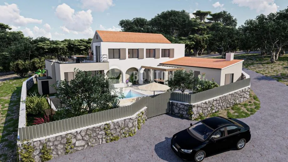 SUPER PONUDA. Kuća za adaptaciju s Pravovaljanom građevinskom dozvolom . Dozvola vrijedi još godinu dana.Dozvola je za kuću sa jednom stambenom jedinicom. U prizemlju kuće nalazi se apartman od 40 m2 s posebnim ulazom koja ja se proteže cijelom širinom parcele. Na desnoj stran inalazi se Konoba s starijim dijelom kuće. Sastoji se od dvije prostorije s Crnom kužinom.Taj dio treba kompletnu renovaciju.