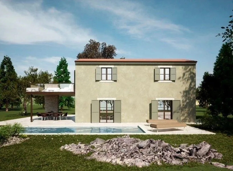 Ca 14 km od Poreča i 8 km od mora- samostojeća vila od ca 160 m2 sa bazenom i predivnim otvorenim pogledom na more- podrum, prizemlje i kat: 2 spavaće sobe, 3 kupatila. Veličina parcele 568 m2.