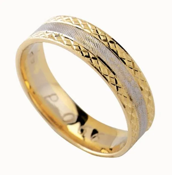Kombinacija dvije boje zlata. Širina prstena 5 mm (1,25-2,50-1,25). Moguća je izrada i u drugim kombinacijama (bijelo-crveno, žuto-crveno), ili u jednoj boji.