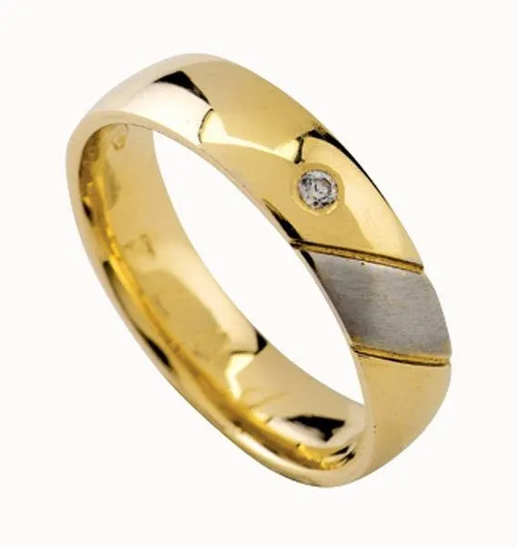 Prsten od žutog zlata sa bijelim umetkom. Širina prstena je 5 mm. Može se izraditi i u drugim kombinacijama boja sa ili bez kamena.