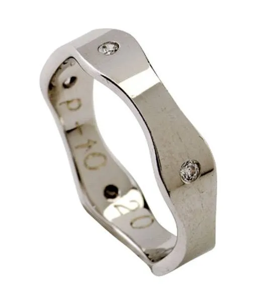 Bijelo zlato sa pet kamenova. Širina prstena je 5 mm (na širokom dijelu), a promjer kamena 1,8 mm. Moguća je izrada u žutoj ili crvenoj boji zlata sa ili bez kamenova. Kamen može biti cirkon ili dijamant.
