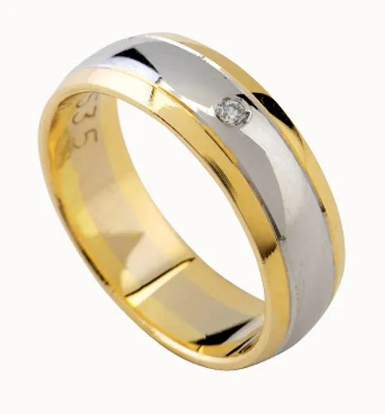 Kombinacija dvije boje zlata sa kamenom. Promjer kamena je 1,8 mm, a širina prstena 6 mm (1,25-3,50-1,25). Moguća je izrada i u drugim kombinacijama boja (bijelo-crveno, žuto-crveno), ili u jednoj boji sa ili bez kamena. Kamen može biti cirkon ili dijamant. Cijena na upit.