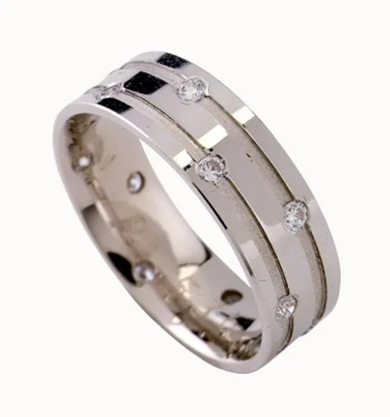 Bijelo zlato sa dvanaest kamenova. Širina prstena je 6 mm, a promjer kamena 1,8 mm. Moguća je izrada u žutoj ili crvenoj boji zlata sa ili bez kamenova. Kamen može biti cirkon ili dijamant. Cijena na upit.