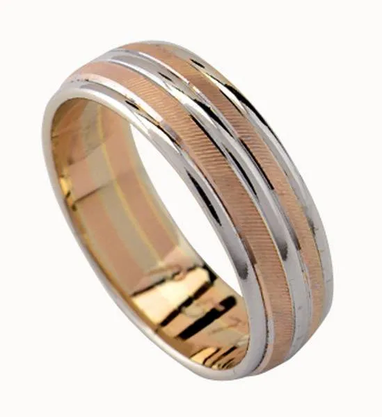 Kombinacija zlata, bijelo-crveno. Širina prstena je 6 mm (1,1-1,35-1,1-1,35-1,1). Moguća je izrada i u drugim kombinacijama boja (žuto-bijelo, žuto-crveno) ili u jednoj boji. Cijena na upit.