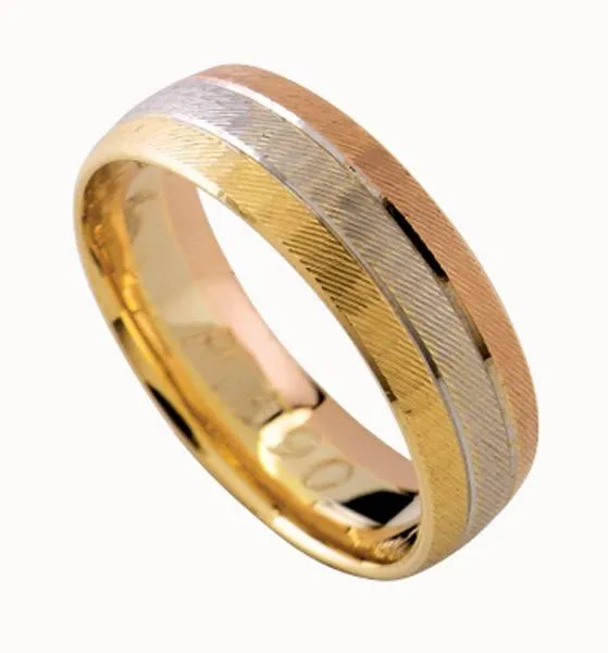 Kombinacija tri boje zlata (žuto,bijelo i crveno). Širina prstena je 6 mm (2-2-2). Moguća je izrada u dvije ili u jednoj boji zlata. Cijena na upit.