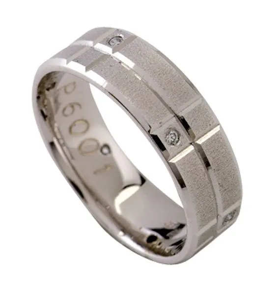 Bijelo zlato sa šest kamena. Širina prstena je 6 mm, a promjer kamena 1,3 mm. Moguća je izrada u žutoj ili crvenoj boji zlata sa ili bez kamenova. Kamen može biti cirkon ili dijamant. Cijena na upit.