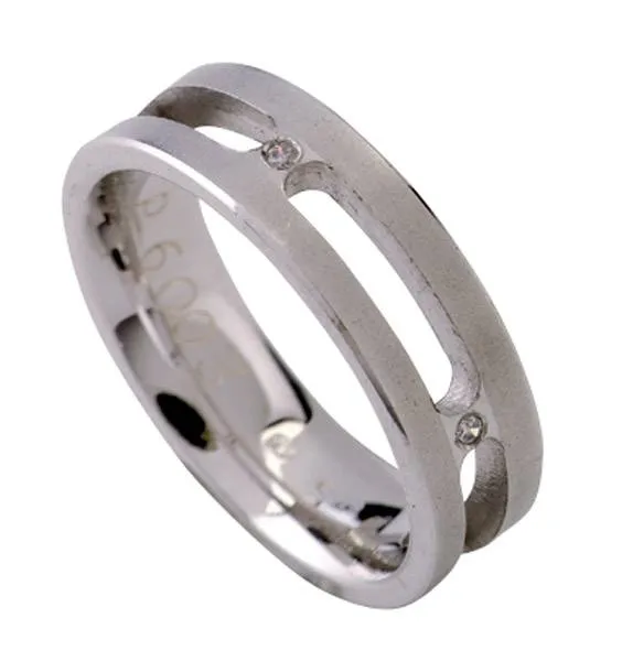 Bijelo zlato sa dva kamena. Širina prstena je 6 mm ,a promjer kamena 1,3 mm. Moguća je izrada u žutoj ili crvenoj boji zlata sa ili bez kamenova. Kamen može biti cirkon ili dijamant. Cijena na upit.