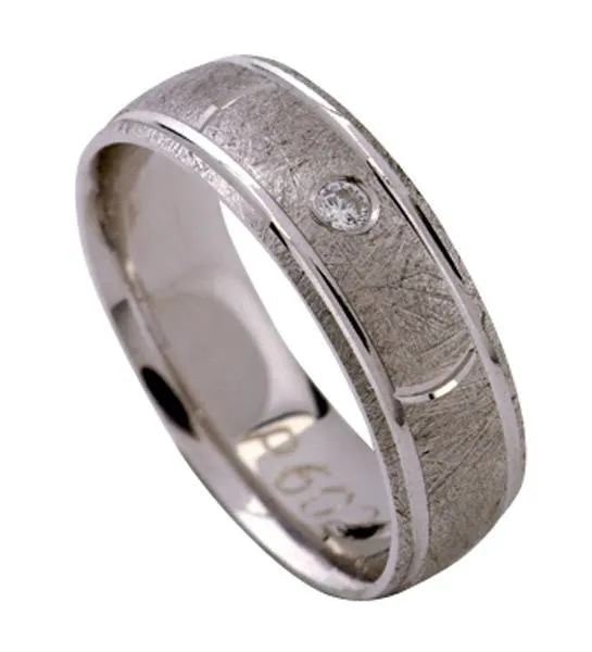 Bijelo zlato sa kamenom. Širina prstena je 6 mm, a promjer kamena 2,0 mm. Moguća je izrada u žutoj ili crvenoj boji zlata sa ili bez kamenova. Kamen može biti cirkon ili dijamant. Cijena na upit.