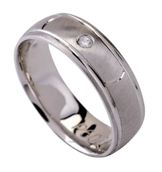 Bijelo zlato sa kamenom. Širina prstena je 6 mm, a promjer kamena 2 mm. Moguća je izrada u žutoj ili crvenoj boji zlata sa ili bez kamenova. Kamen može biti cirkon ili dijamant. Cijena na upit.